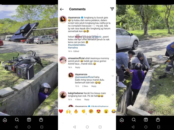 “Longkang tu busuk gais tapi kalau dah nama pelakon, dalam skrip tulis jatuh longkang kau redha je lah. Tiada rungutan sebab saya (emoji hati) kerja saya. Bila lagi nak rasa lepak dalam longkang yang harum semerbak kan.