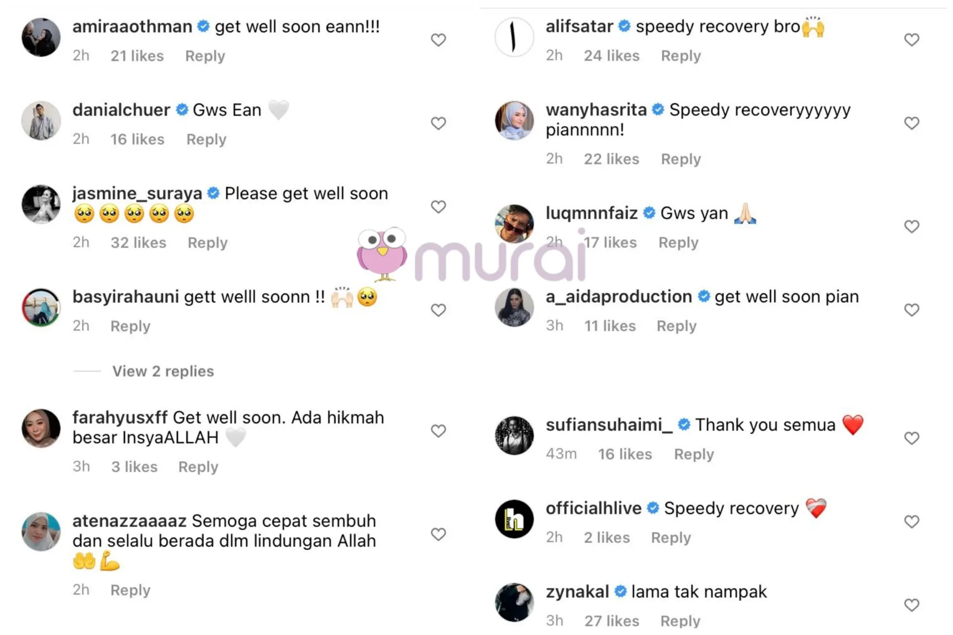 Ruangan komen di hantaran Sufian itu disusuli dengan komen rakan selebriti dan peminat yang mentitipkan doa buat dirinya agar diberikan kesembuhan.