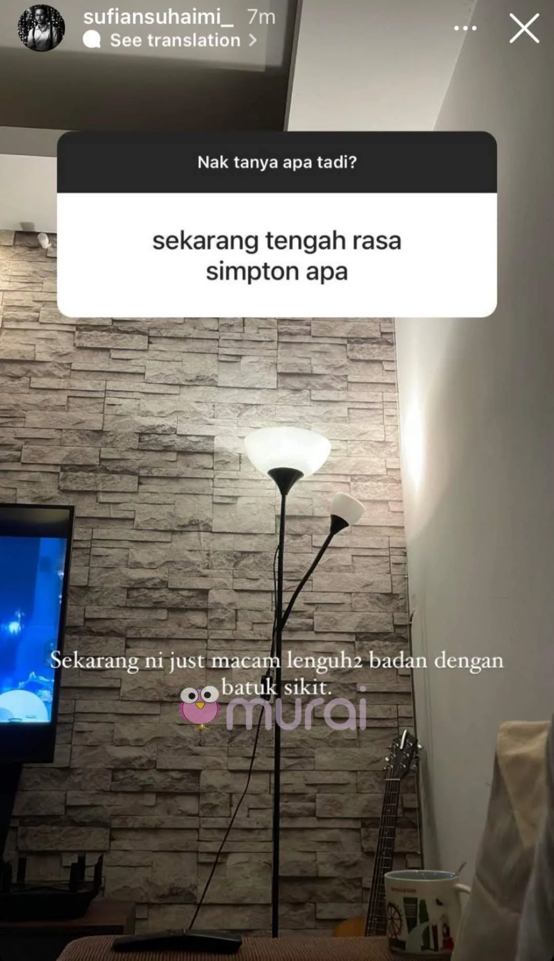 “Sekarang ni just macam lenguh badan dengan batuk sikit.”- dedah Sufian