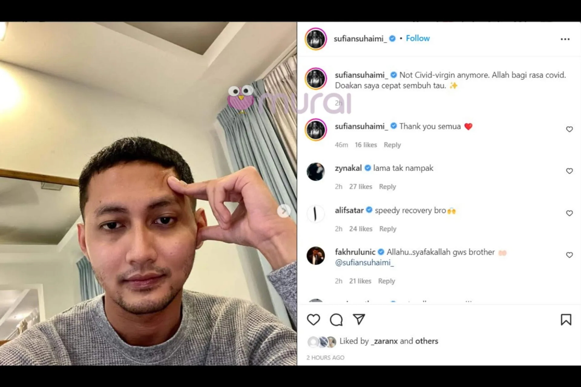 Penyanyi, Sufian Suhaimi menerusi hantaran di Instagram telah berkongsi satu khabar sedih mengenai dirinya telah disahkan positif COVID-19.