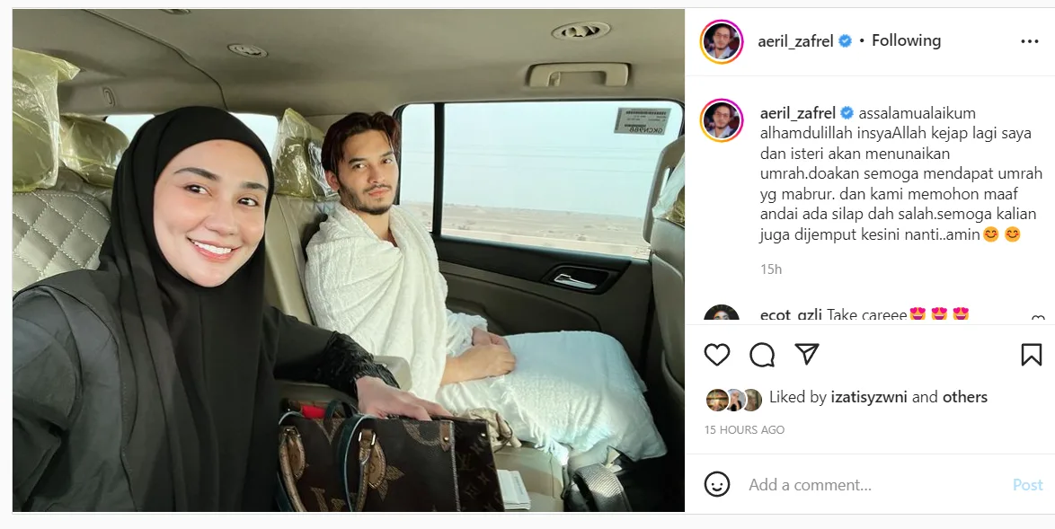 Menerusi hantaran di Instagram, Aeril memohon agar orang ramai dapat menitipkan doa buat mereka agar ziarah dan umrah mereka diterima Allah serta memohon maaf sekiranya terdapat salah dan silap.