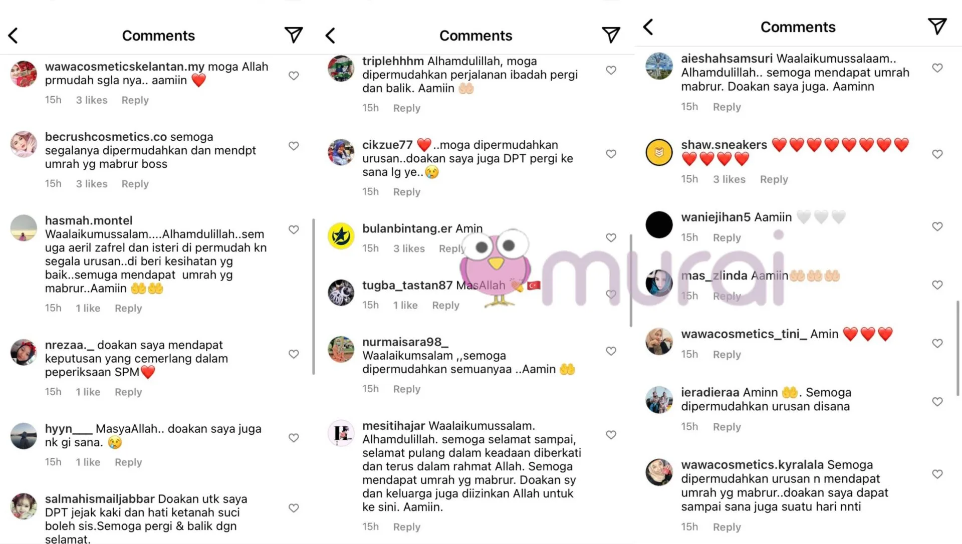 Di ruangan komen, rata-rata peminat membanjiri dengan pelbagai ucapan dan mendoakan agar urusan ibadah umrah Aeril dan Wawa dipermudahkan.