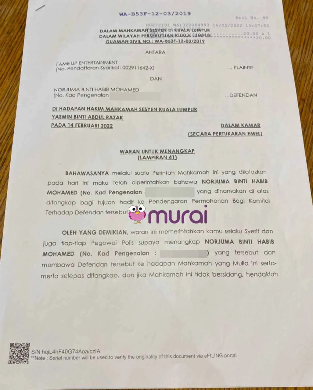 Susulan itu, serahan waran tangkap akan diberikan kepada pihak polis untuk menjalankan tindakan lanjut. Terdahulu, Mahkamah Sesyen Kuala Lumpur telah memerintahkan peguam syarikat Fame Up Entertainment untuk memfailkan waran tangkap terhadap Norjuma.