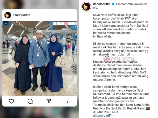 Untuk rekod, Nora menjalani ibadah umrah bersama suaminya Dr Rushdi Ramli dan anak ketiganya Putri Nur Dahlia. Semoga Nora sekeluarga mendapat umrah yang mabrur dan dipermudahkan urusan sepanjang di tanah suci.