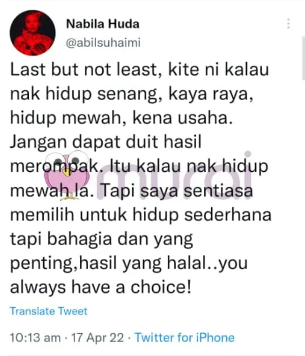“Kita ni kalau nak hidup senang, kaya raya, hidup mewah, kena usaha. Jangan dapat duit hasil merompak. Itu kalau nak hidup mewah lah. Tapi saya sentiasa memilih untuk hidup sederhana tapi bahagia dan yang penting. Hasil yang halal. Anda sentiasa ada pilihan!” ciap Nabila
