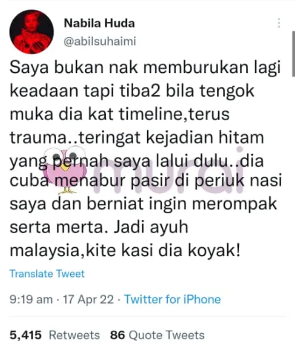 “Saya bukan nak memburukan lagi keadaan tapi tiba-tiba tengok muka dia kat timeline, terus trauma.. Teringat kejadian hitam yang pernah saya lalui dulu.. Dia cuba menabur pasir di periuk nasi saya dan berniat ingin merompak serta merta. Jadi ayuh Malaysia, kita kasi dia koyak!” ciap Nabila