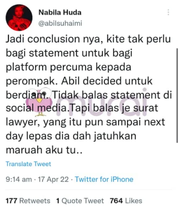 “Jadi konklusinya, kita tak perlu bagi kenyataan untuk bagi platform percuma kepada perompak. Abil buat keputusan untuk berdiam. Tidak balas kenyataan di media sosial. Tapi balas je surat peguam, yang itu pun sampai keesokan hari lepas dia dah jatuhkan maruah aku tu..” ciapnya lagi
