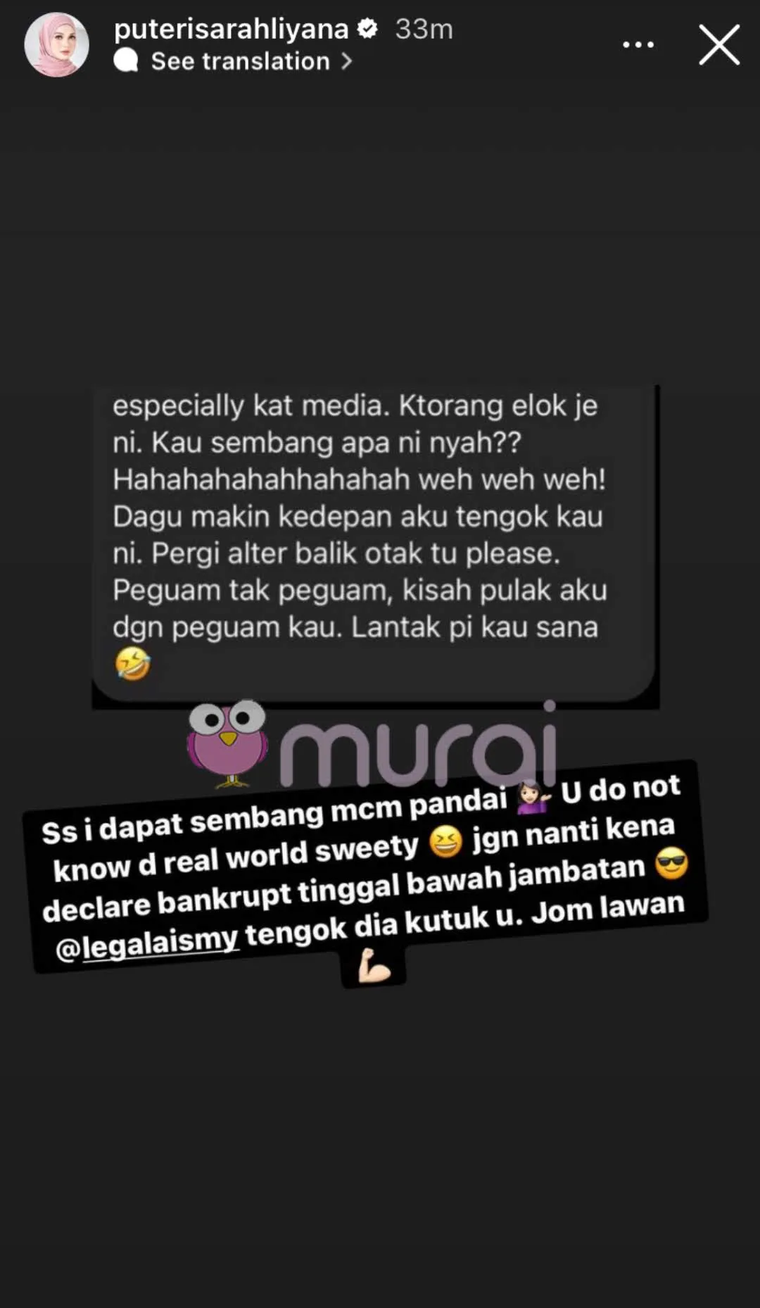 “Ss i dapat sembang macam pandai. Awak tak tahu dunia sebenar sweety. Jangan nanti kena declare bankrupt tinggal bawah jambatan. @legalaismy tengok dia kutuk u. Jom Lawan”-Puteri Sarah