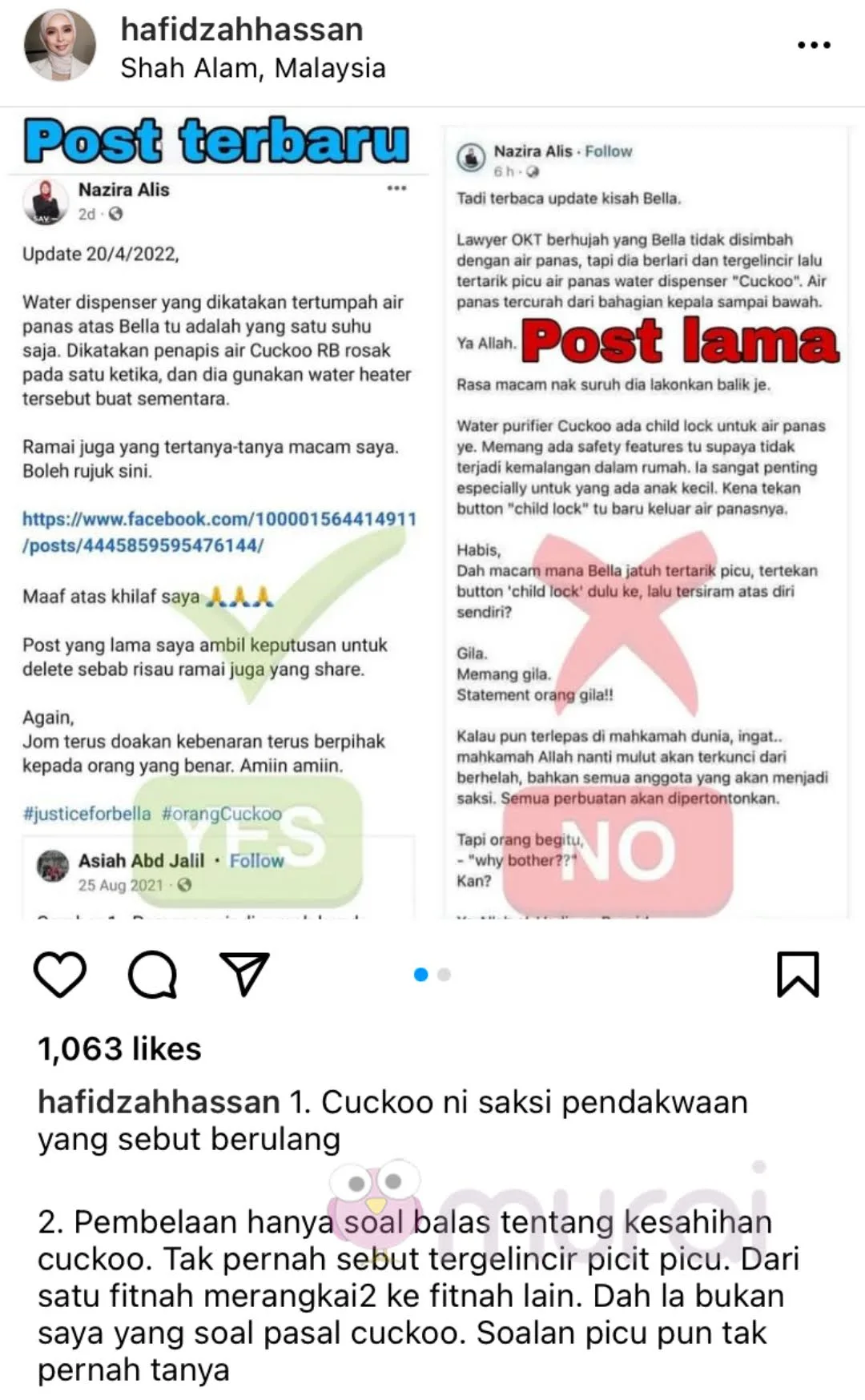 Menerusi hantaran nya di Instagram, peguam yang mewakili pengasas Rumah Bonda, Siti Bainun ini menjelaskan bahawa penapis air Cuckoo itu adalah yang disebut oleh saksi pendakwaan berulang kali.