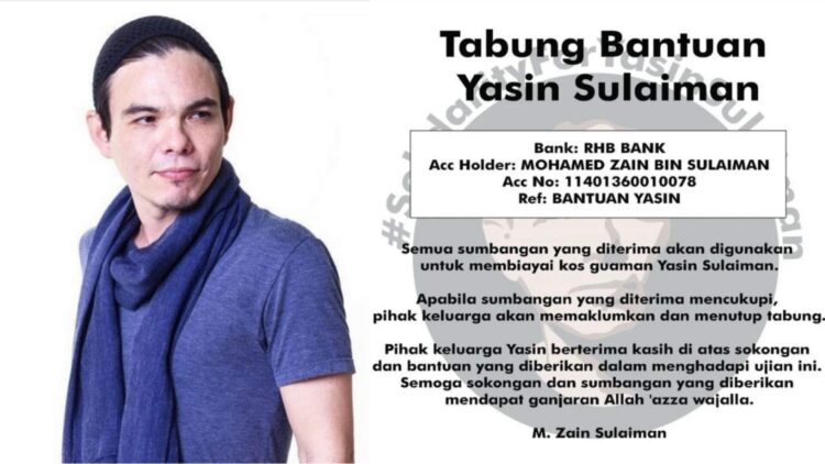 Menerusi hantaran di Instagram dengan kebenaran Yasin, pihak keluarganya memohon sumbangan orang ramai untuk membiayai kos guaman Yasin Sulaiman.