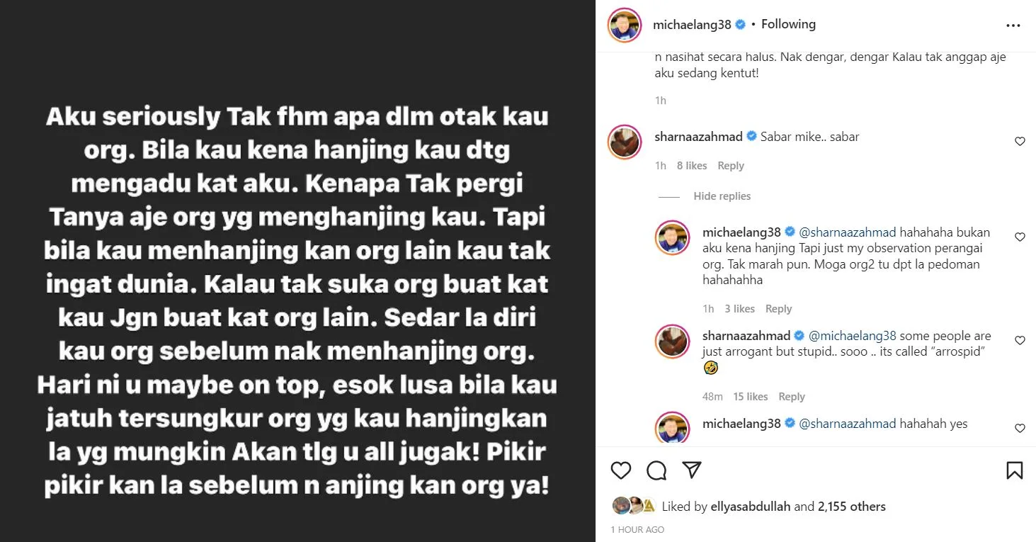 Selain meminta Michael Ang untuk bersabar, dia juga menyatakan bahawa ada sesetengah manusia yang hanya sombong, tetapi bodoh. Komen tersebut telah di ‘like’ oleh netizen seolah-olah bersetuju dengan pendapat Sharnaaz.