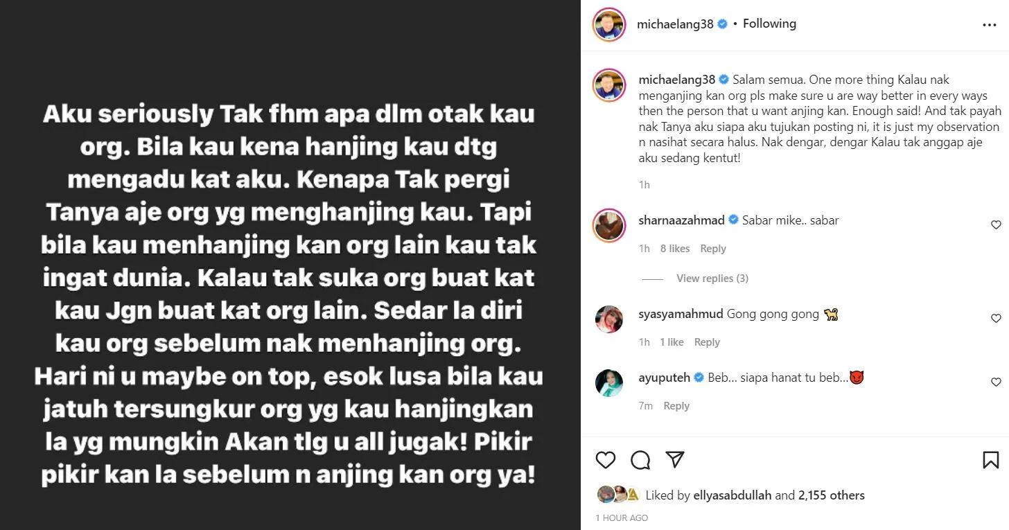 Terbaru, Michael Ang ada memuat naik satu status mengenai isu memerli ataupun ‘menganjing’ yang terjadi terhadap orang yang disekelilingnya.