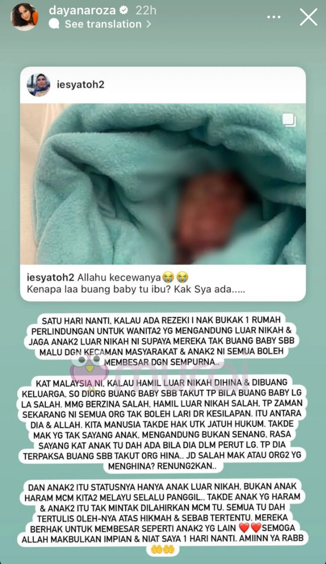 “Kita manusia takde hak untuk jatuh hukum. Takde mak yang tak sayang anak. Mengandung bukan senang. Rasa sayang kat anak tu dah ada bila dia dalam perut lagi. Tapi dia terpaksa buang sebab takut orang hina. Jadi salah mak atau orang-orang yang menghina? Renung-renungkan”-Dayana Roza