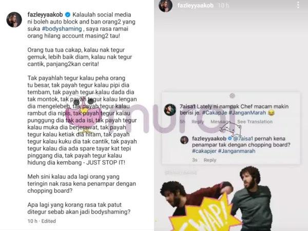 Selain Janna Nick, cef selebriti terkenal Datuk Fazley Yaakob juga menerima komen yang mengatakan beliau tentang keadaan fizikal beliau semakin berisi. Menerima komen sebegitu rupa yang berbaur seperti body shaming, Fazley beri komen balas yang ringkas.