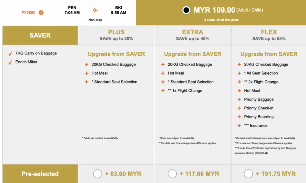 Makanan siap termasuk dalam harga tambang sekiranya anda memilih pakej upgrade PLUS, EXTRA ataupun FLEX. Setiap pakej mempunyai harga dan kelebihan yang berbeza. Jika anda hanya mengambil pakej SAVER, Firefly menawarkan 7KG Carry on Baggage.