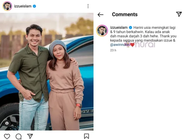 “Harini usia meningkat lagi dan 9 tahun berkahwin. Kalau ada anak, dah masuk darjah 3 dah hehe. Terima kasih kepada semua yang mendoakan Izzue dan @awinnurin” tulisnya