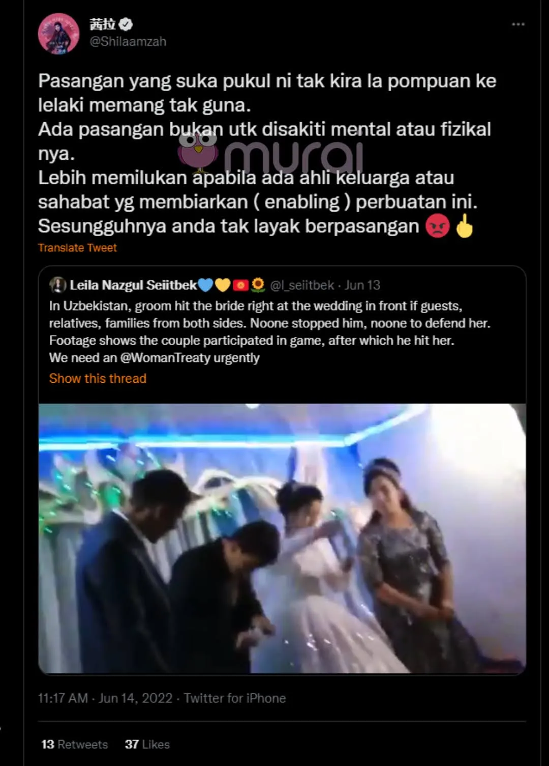 Baru-baru ini tular sebuah video di media sosial mengenai seorang pengantin lelaki memukul pengantin wanita dalam satu majlis perkahwinan di Uzbekistan yang menimbulkan reaksi dari pelbagai pihak termasuklah penyanyi dan pelakon, Shila Amzah.