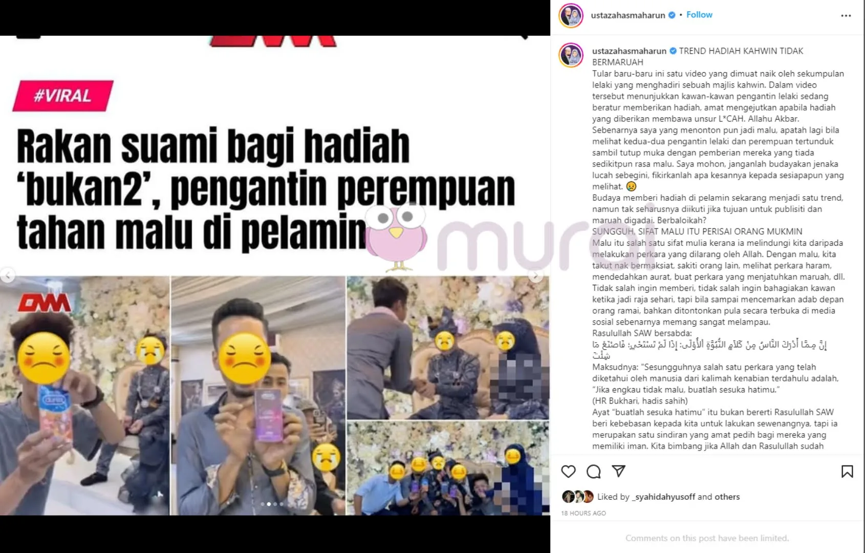 Sebenarnya saya yang menonton pun jadi malu, apatah lagi bila melihat kedua-dua pengantin lelaki dan perempuan tertunduk sambil tutup muka dengan pemberian mereka yang tiada sedikitpun rasa malu.”-Tegur Ustazah Asma menerusi Instagram.