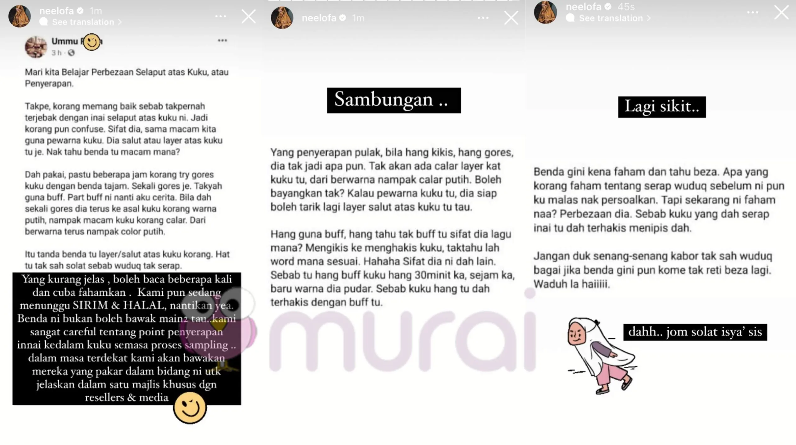 “Kami pun sedang menunggu SIRIM & HALAL, nantikan yea. Benda ni bukan boleh bawak main-main tau..Kami sangat careful tentang point penyerapan innai ke dalam kuku semasa proses sampling.”- Jelas Neelofa