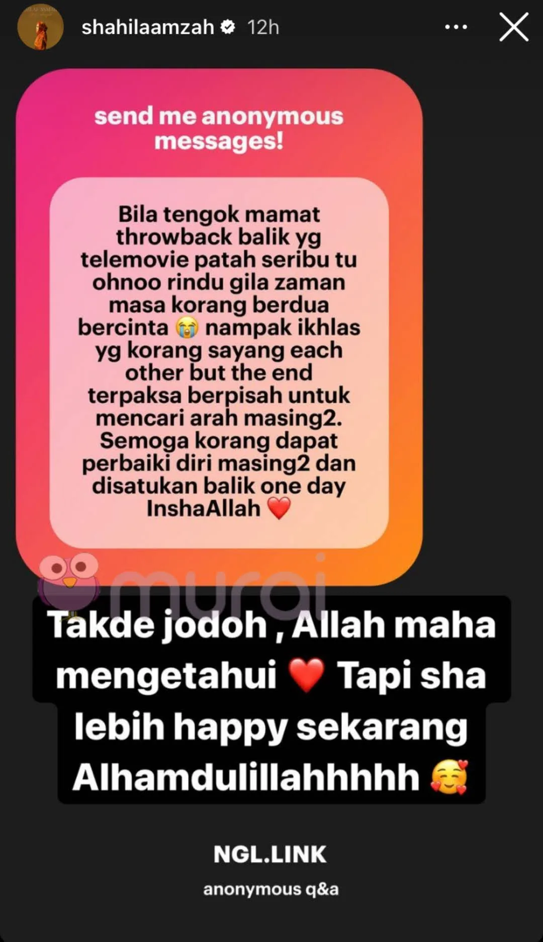 “Takde jodoh, Allah maha mengetahui. Tapi Sha lebih happy sekarang. Alhamdulillah.”- Jawab Shila Amzah