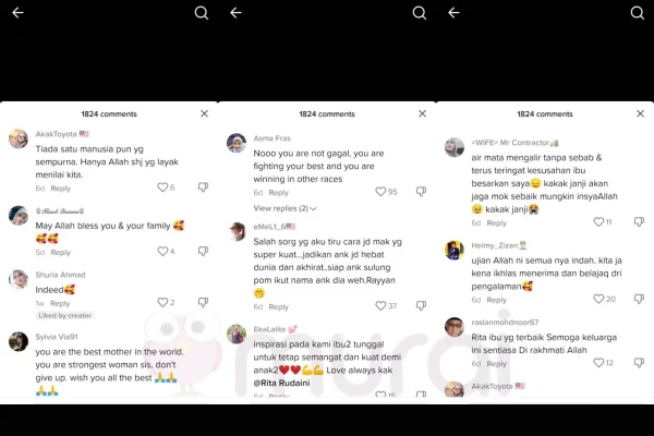 “Anda ibu yang terbaik di dunia ini. Anda wanita yang kuat kak. Jangan putus asa. Doakan yang terbaik untuk anda.”Komen warganet