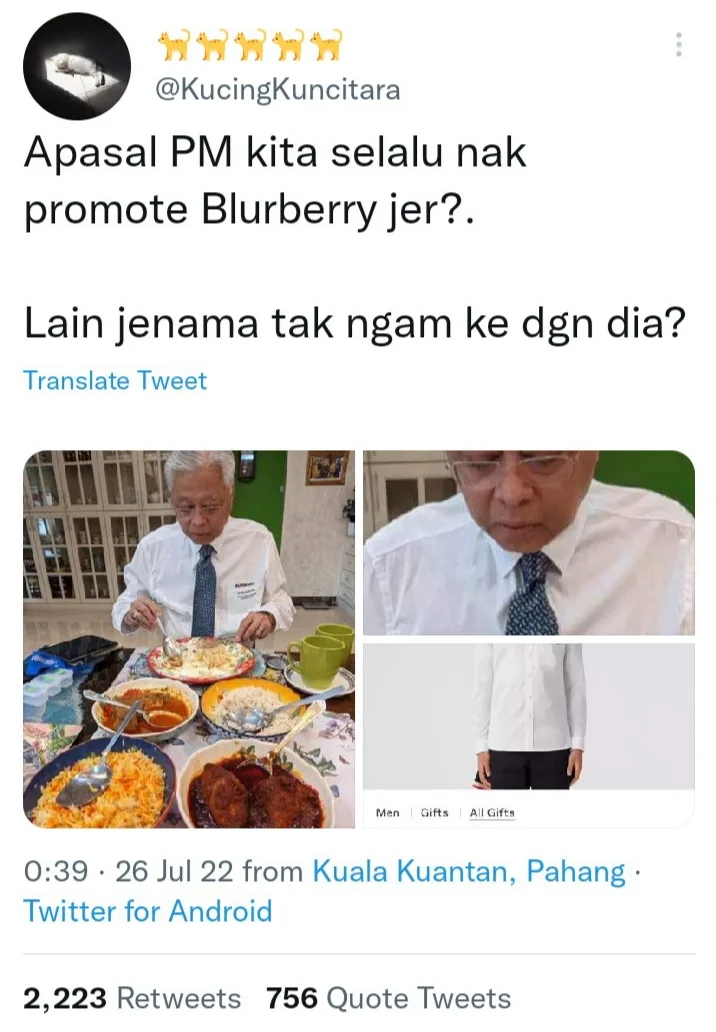 Baru-baru ini, tular gambar Dato Seri Ismail Sabri memakai baju berjenama Burberry sambil menikmati juadah makanan di laman media sosial. Seorang pengguna di Twitter berkongsi gambar Dato Ismail Sabri dan mengkritik bahawa mengapa Dato Seri Ismail Sabri hanya memakai produk jenama Burberry seolah-olah ingin mempromosikan jenama mewah tersebut.