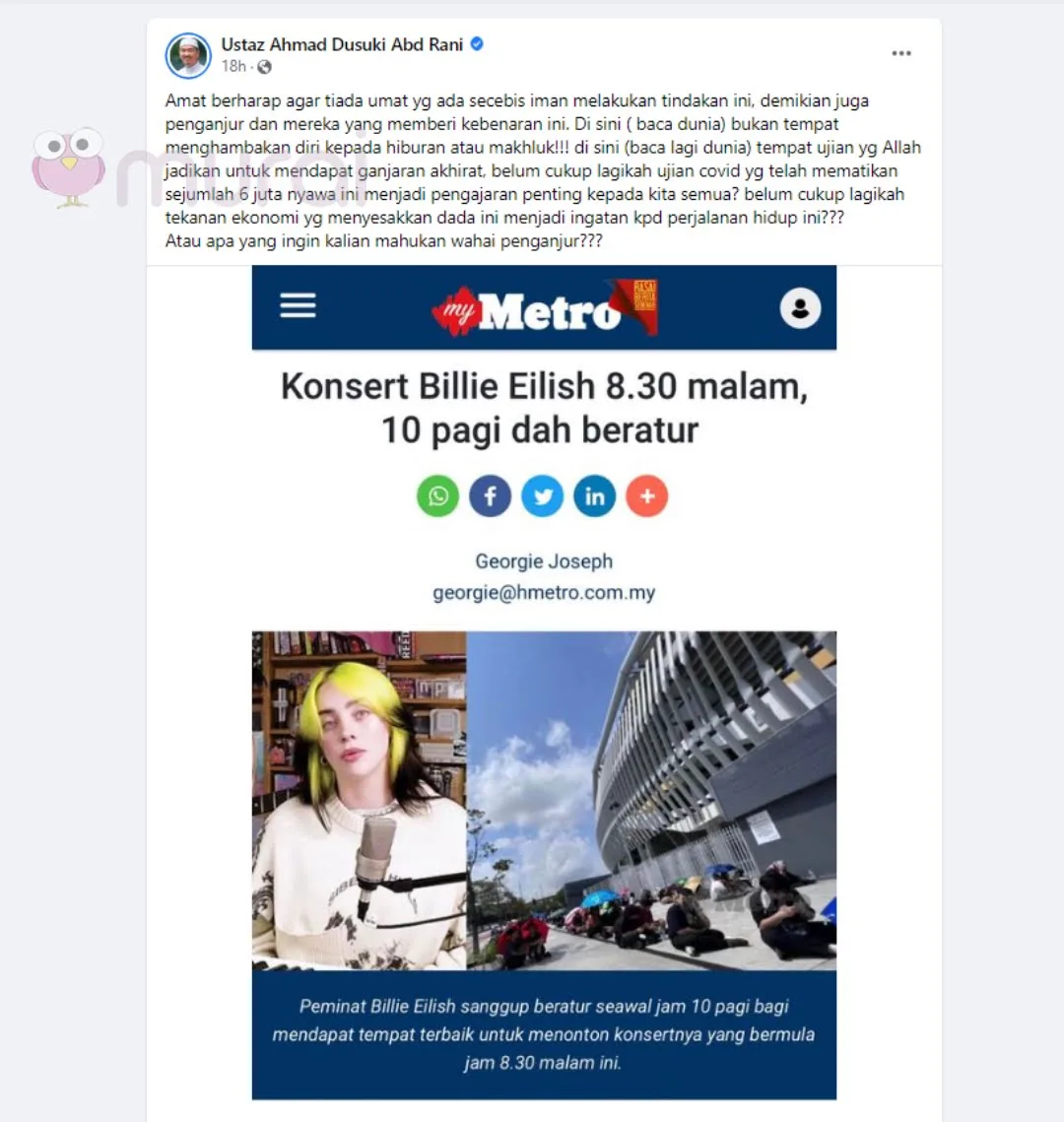 Isu peminat sanggup berpanas dan beratur untuk menonton konsert penyanyi antarabangsa itu telah mendapat perhatian oleh pendakwah terkenal, Ustaz Ahmad Dusuki yang tampil memberikan teguran terhadap isu tersebut.