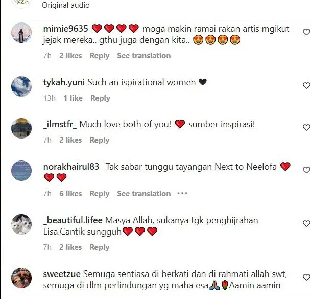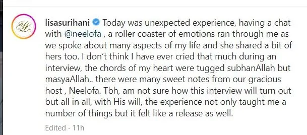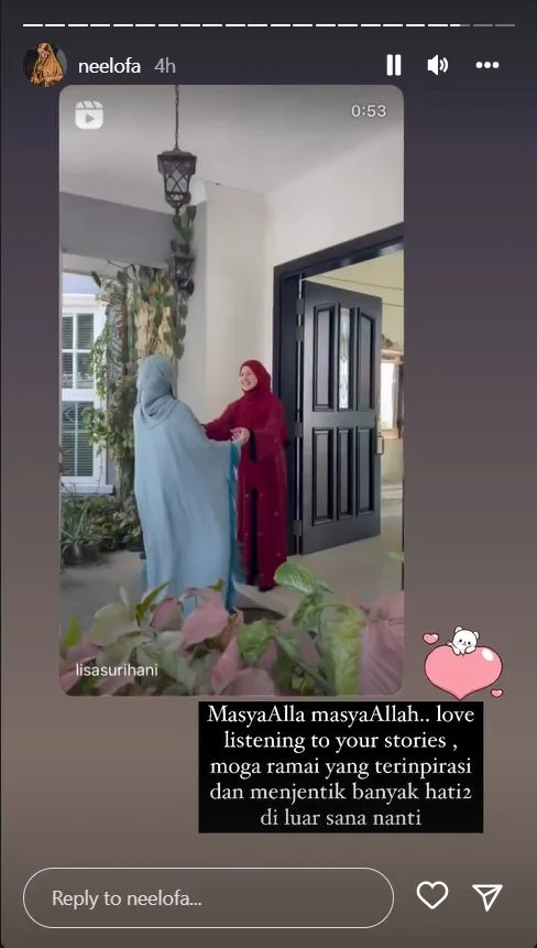 Neelofa telah membuat IG Stories dengan meletakkan caption bahawa dia suka mendengar apa yang diceritakan oleh Lisa. Dia juga berharap agar orang ramai akan mendapat inspirasi.