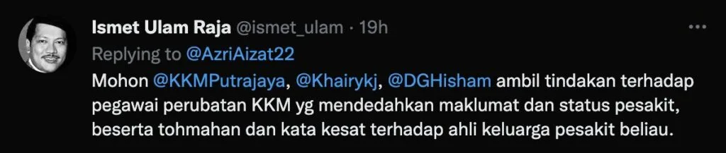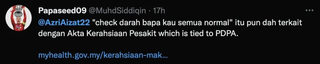 Sementara itu, para pengguna Twitter hairan kerana berdasarkan pemahaman mereka, seorang pengamal perubatan tidak boleh mendedahkan butiran peribadi pesakit yang dirawatnya.