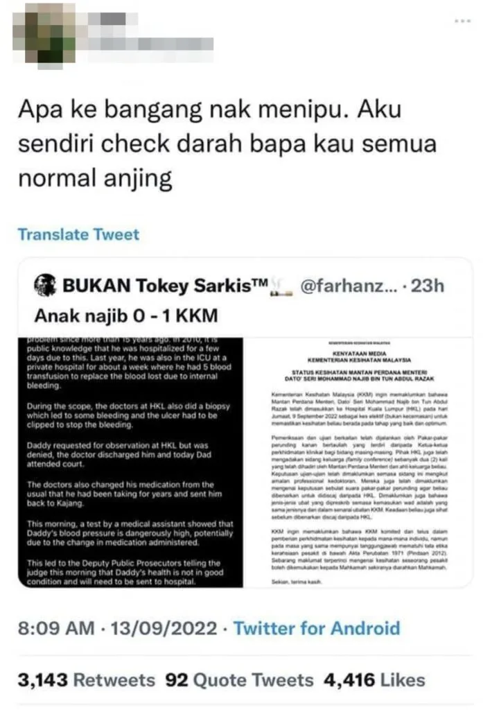 “Apa ke bangang nak menipu. Aku sendiri check darah bapa kau semua normal anjing,” kata lelaki berkenaan dalam ciapan Twitternya yang tular sejak semalam.