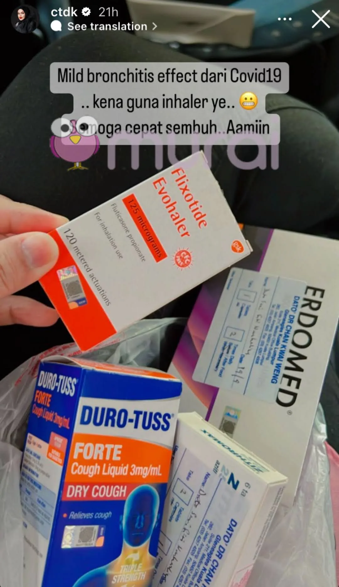 “Mild Bronchitis effect dari COVID-19. Kena guna inhaler ya. Semoga cepat sembuh..Aaminn.”-Tulis Tokti