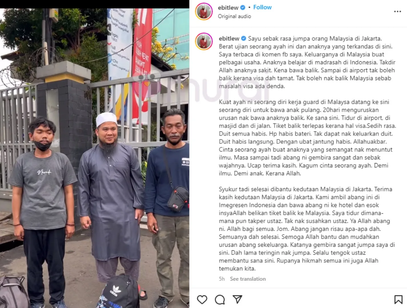 Anaknya belajar di madrasah di Indonesia. Takdir Allah anaknya sakit. Kena bawa balik. Sampai di airport tak boleh balik kerana Visa dah tamat. Tak boleh balik Malaysia sebab masalah Visa ada denda.”-Kongsi Ebit
