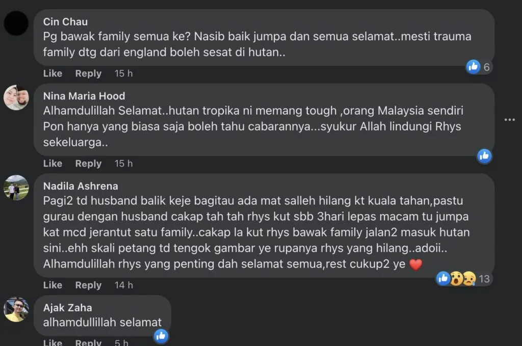 Rata-rata peminat di ruangan komen menyuarakan rasa lega dan bersyukur Rhys William dan ahli keluarganya selamat ditemui.