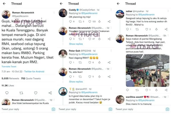 Baru-baru ini satu perkongsian milik Roman Akramovich di Twitter menarik perhatian Murai MY dan juga warganet, di mana pemuda ini berkongsi pengalaman bercuti di negeri Terengganu, Malaysia.