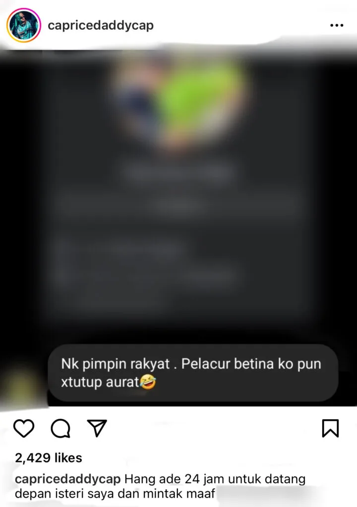 Berang membaca ayat yang dipercayai ditujukan buat isterinya, Farra Inalis, Caprice memberikan masa 24 jam buat individu tersebut untuk datang ke hadapan isterinya dan memohon maaf.