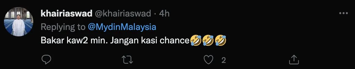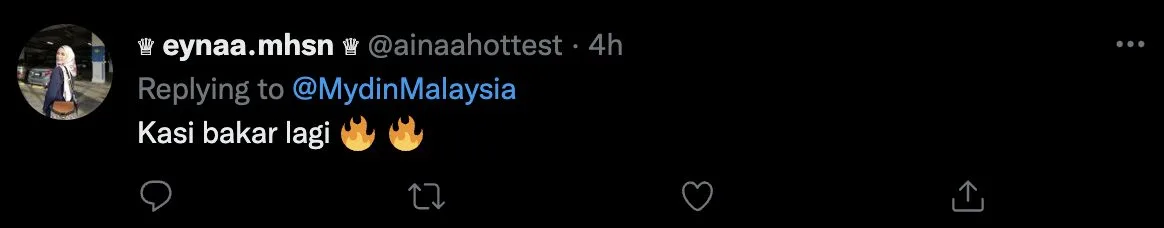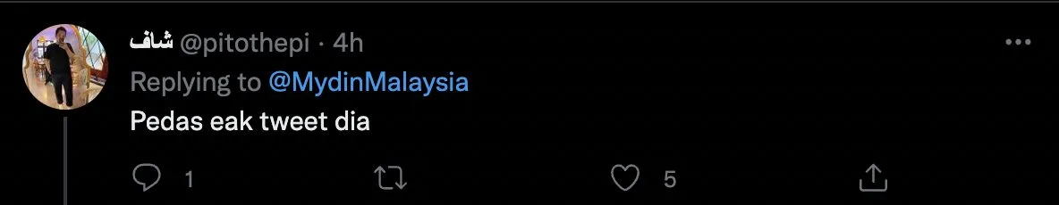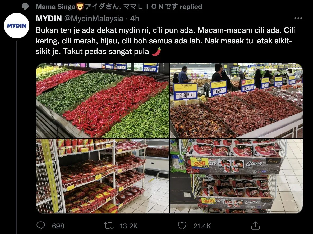 Sementara itu, menerusi laman twitter @mydinMalaysia, mereka telah memuatnaik tweet terbaru iaitu mengajak orang ramai untuk membeli cili di MYDIN. Tulis mereka, di MYDIN bukan sahaja menjual teh tetapi terdapat pelbagai jenis cili.