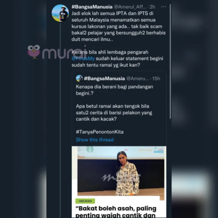 “Jadi elok lah semua IPTA dan IPTS di seluruh Malaysia menamatkan semua kursus lakonan yang ada. Tak baik scam bakal-bakal pelajar yang bersungguh-sungguh berhabis duit mencari ilmu.”-Tulis Amerul