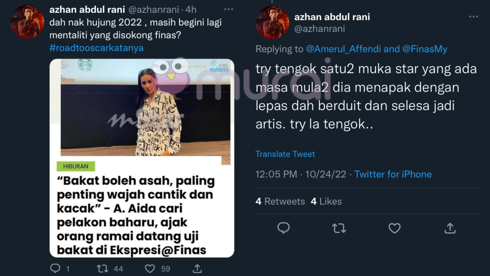 “Dah nak hujung 2022, masih begini lagi mentaliti yang disokong FINAS? #roadtooscarkatanya.”-Ciapan Azhan