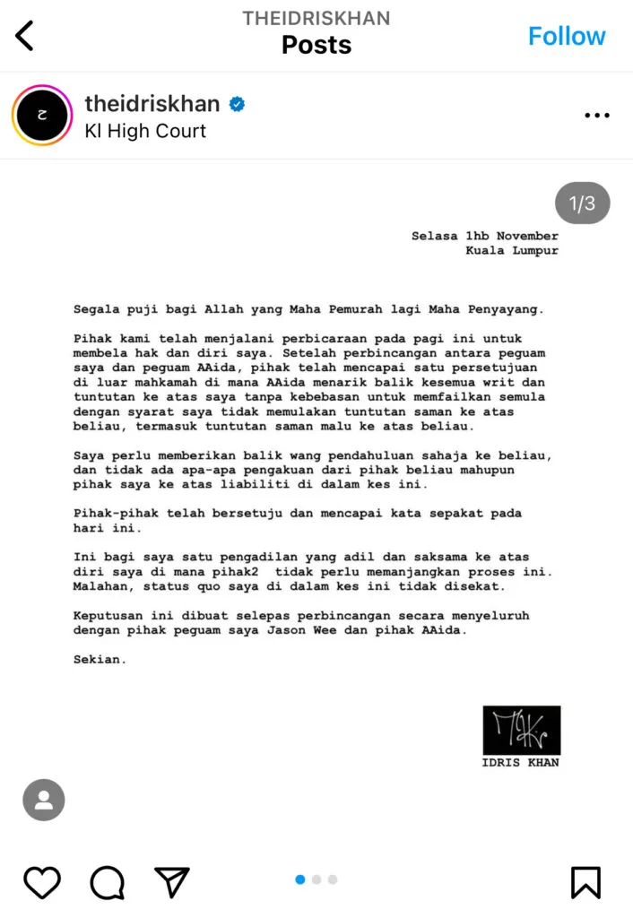 “Keputusan ini dibuat selepas perbincangan secara menyeluruh dengan pihak peguam saya Jason Wee dan pihak A. Aida, sekian,” tambahnya lagi.