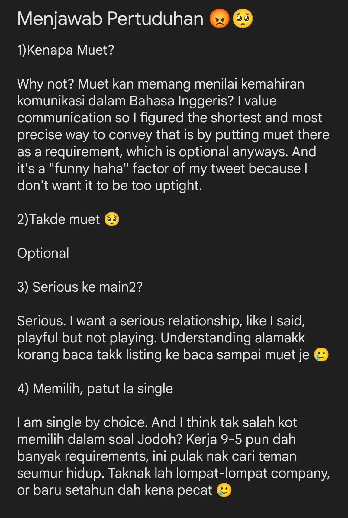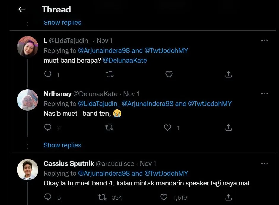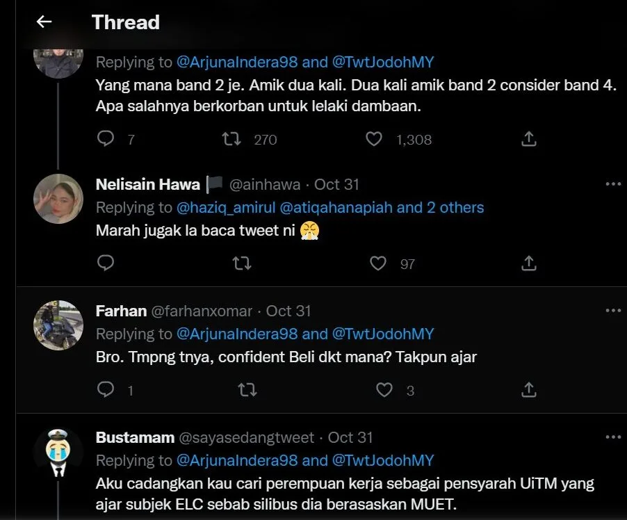 Namun, statement pemuda ini menjadi bualan oleh warganet kerana hanya band Muet itu. Ia dianggap sesuatu yang melampau dalam memilih pasangan hidup. Ada yang mempertikaikan soal pendidikan pemuda ini pula jika mahu pasangannya mempunyai latar belakang pendidikan yang hebat. Namun, beliau membalas dengan jawapan terhadah semua tuduhan netizen.
