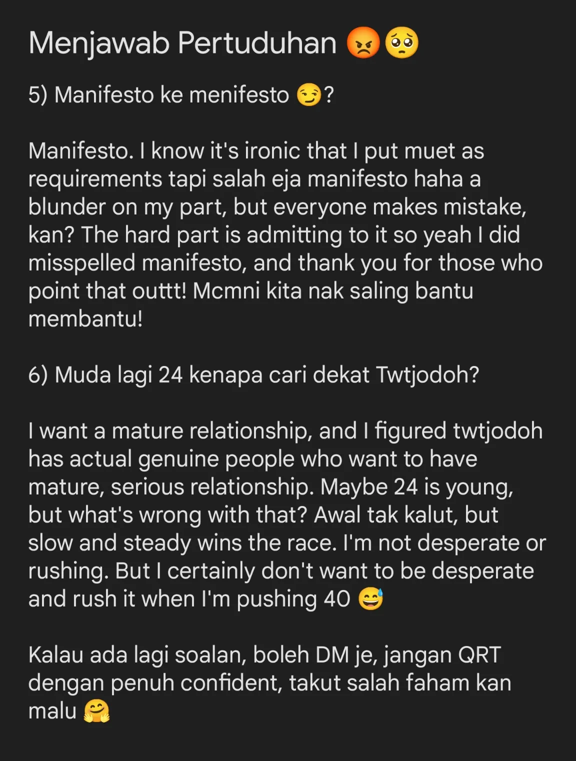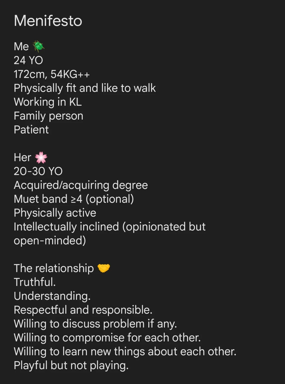 Pemuda yang dikenali sebagai Ajuna ini, beliau post satu senarai ciri-ciri calon isterinya di Twitter iaitu di @TwtJodohMY. Beliau menyenaraikan lima kriteria yang perlu ada untuk menjadi pasangan hidupnya.