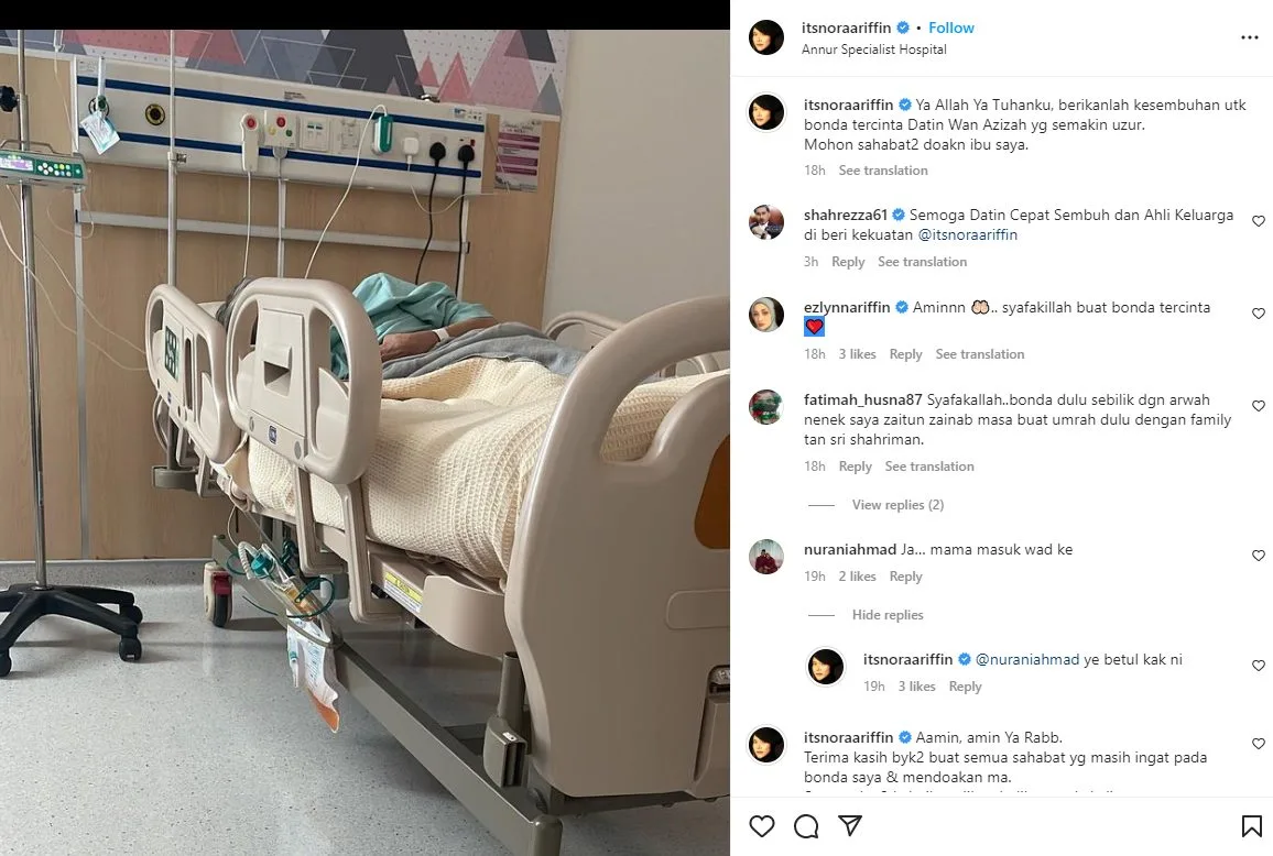 “Ya Allah Ya Tuhanku, berikanlah kesembuhan untuk bonda tercinta Datin Wan Azizah yang semakin uzur. Mohon sahabat-sahabat doakan ibu saya.”-Tulis Nora