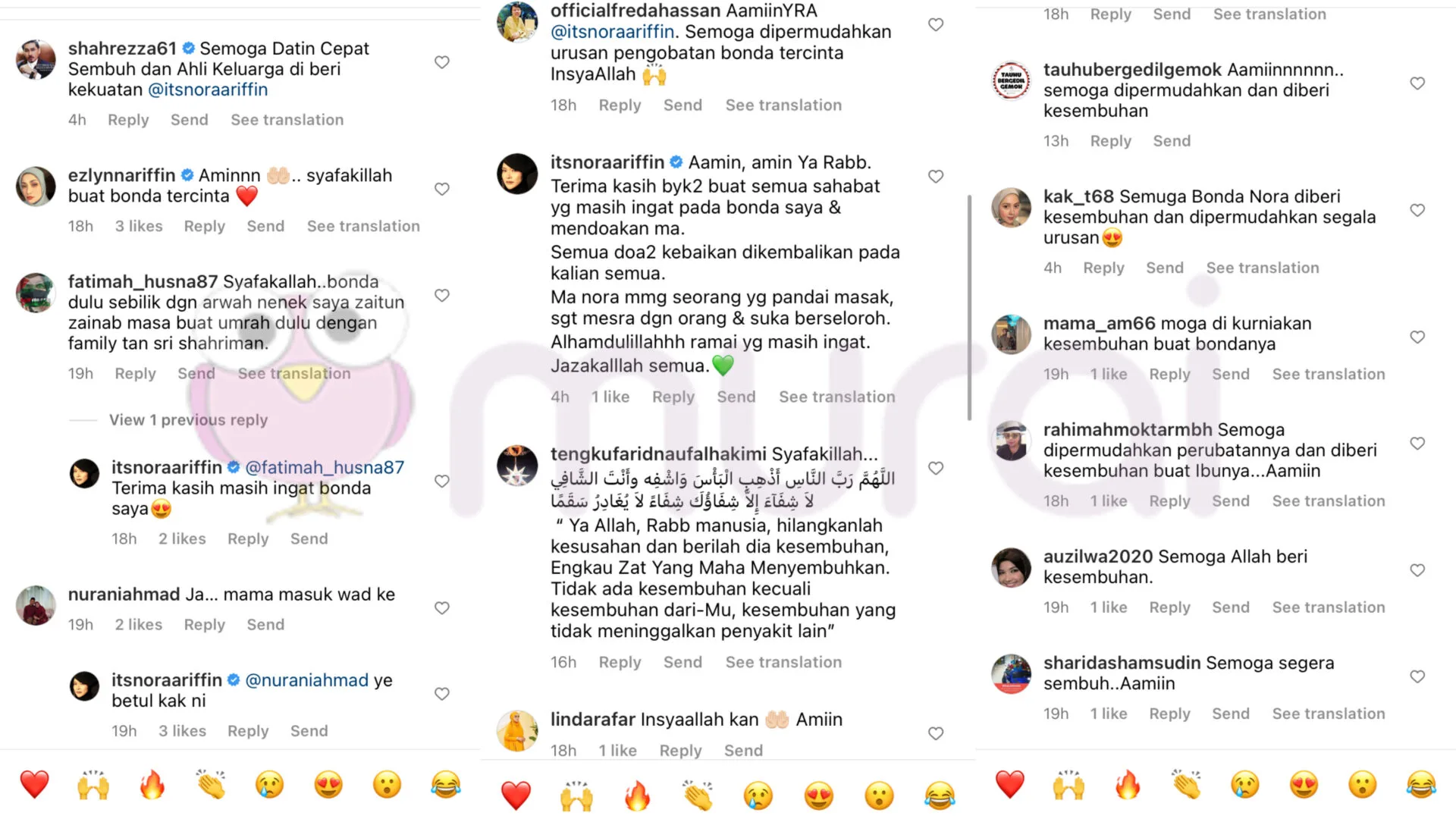 Ruangan komen pelantun Hanya Satu ini dibanjiri dengan ruangan komen para peminat dan rakan artis seperti Ezlynn dan Raja Shah Rezza yang menitipkan doa buat ibunya diberikan kesembuhan dengan cepat.