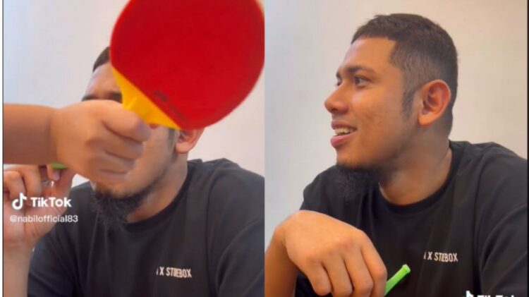 Menerusi video tersebut, terlihat Nabil yang sedang leka meniup mainan yang boleh mengapungkan bola plastik kecil. Namun, apa yang mengejutkannya, anaknya hampir melibas mukanya dengan menggunakan bat ping pong. Tulisnya di video: