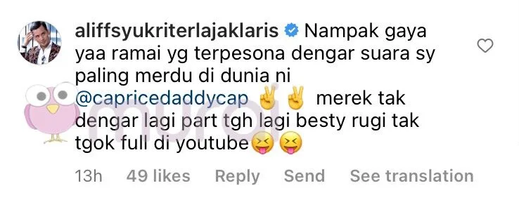 “Nampak gaya ya ramai yang terpesona dengar suara saya peling merdu di dunia ni @capricedaddycap. Mereka tak dengar lagi part tengah best rugi tak tengok full di Youtube.”-Komen Aliff Syukri