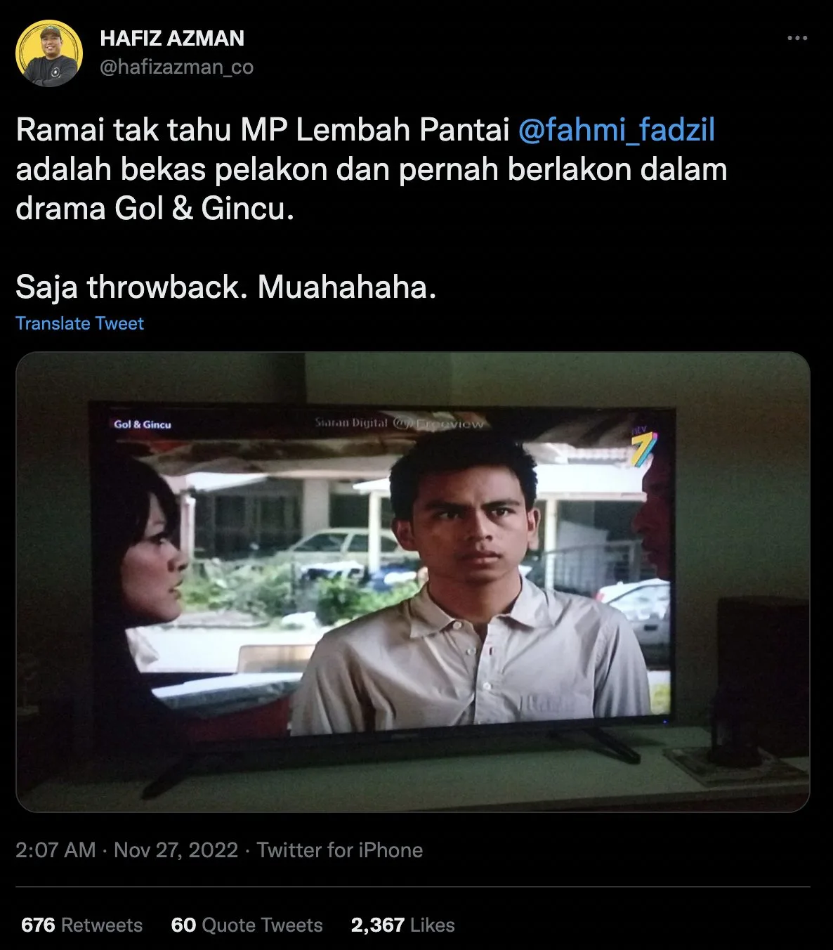 Ahli Parlimen Lembah Pantai, Fahmi Fadzil telah mencuri perhatian netizen di laman twitter. Baru-baru ini, di akaun Twitternya, seorang rakyat Malaysia berkongsi imej Ketua Penerangan PKR itu yang lebih muda di skrin TV semasa dia menjadi pelakon dalam sebuah drama Gol & Gincu The Series, yang disiarkan dari Jun 2006 hingga September 2007 selama 2 musim.