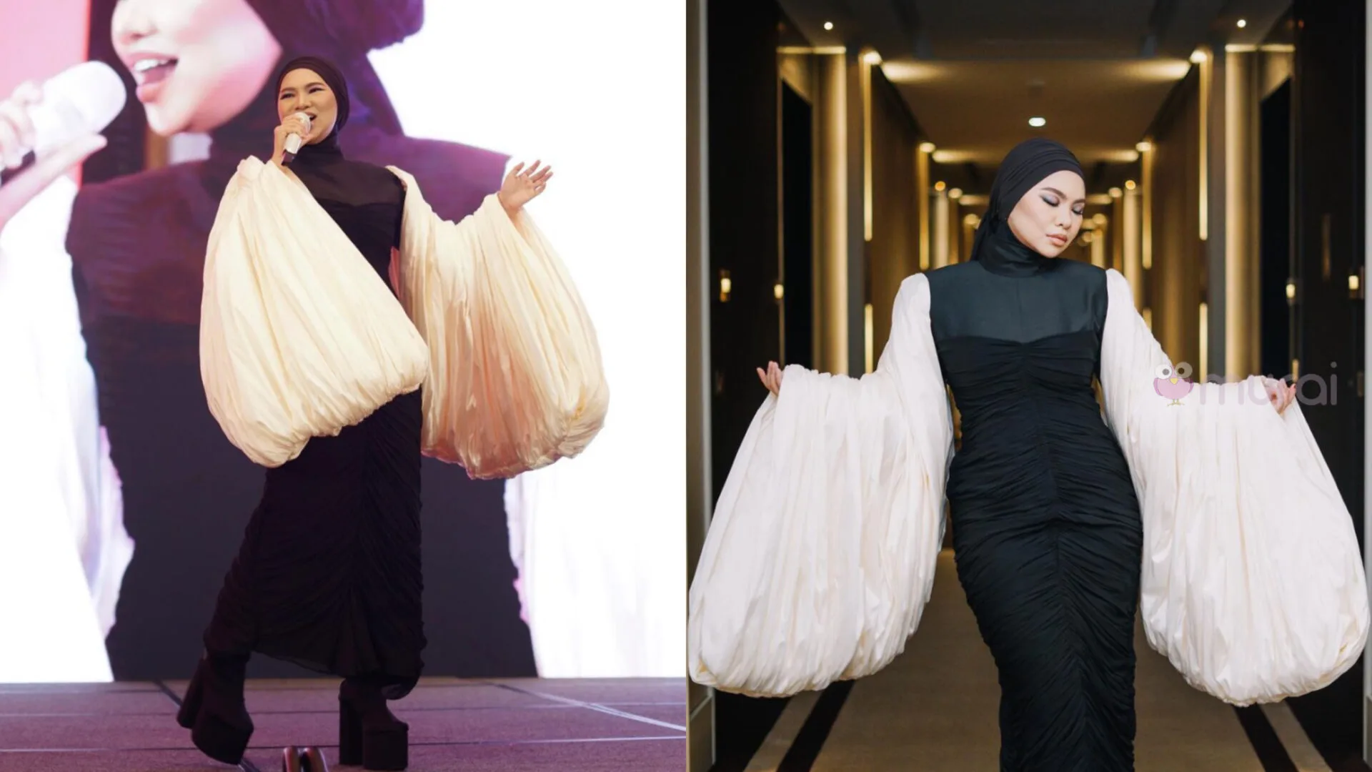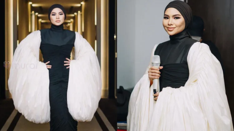 Aina dilihat menggayakan persalinan hitam dan lengan berwarna putih hasil rekaan pereka terkenal, Khuntum .