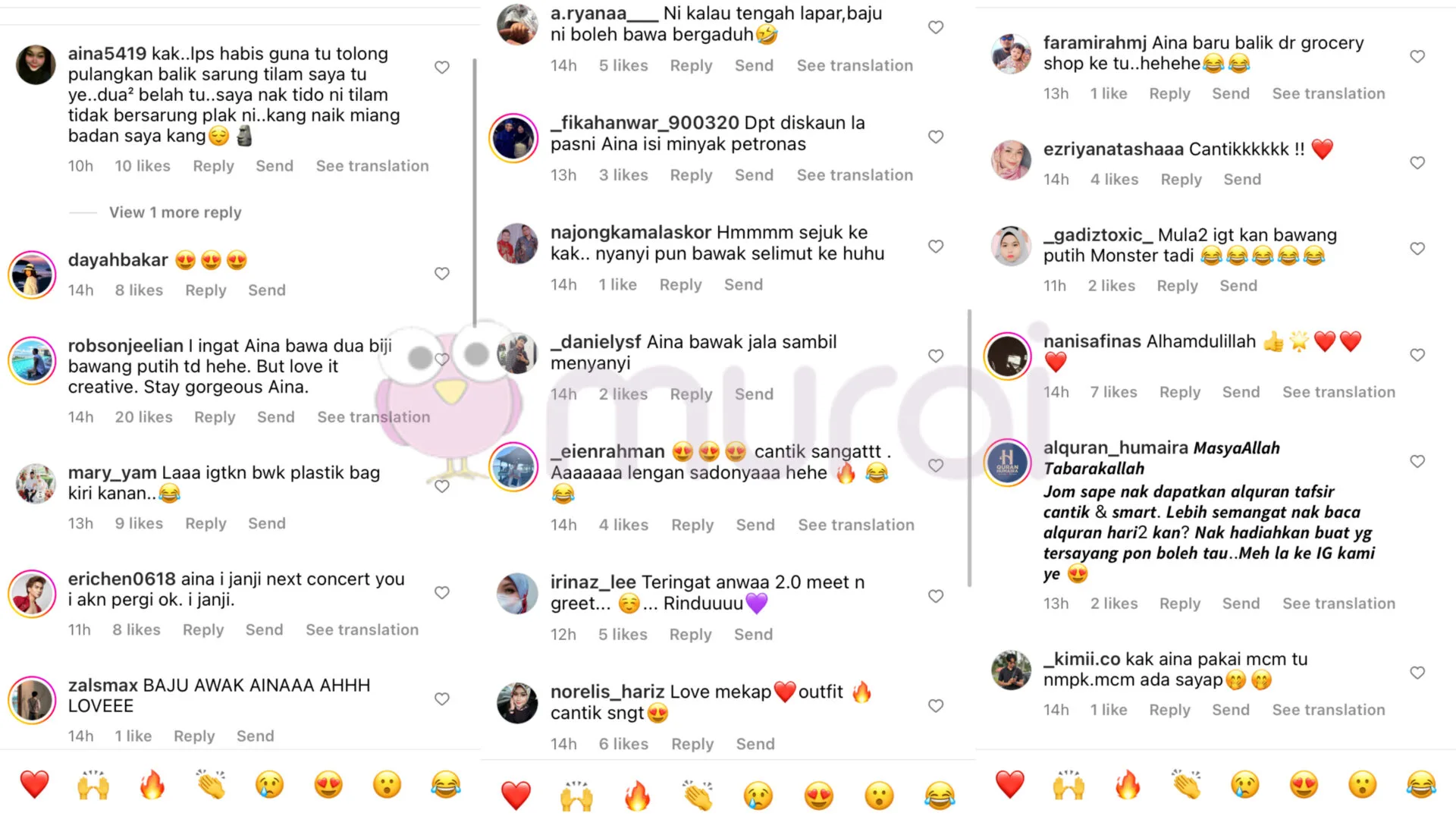 Tinjauan Murai MY di ruangan komen mendapati rata-rata peminat membanjiri hantaran Aina di Instagram dengan kata-kata pujian serta berseloroh terhadap busana penyanyi lagu Sumpah itu.