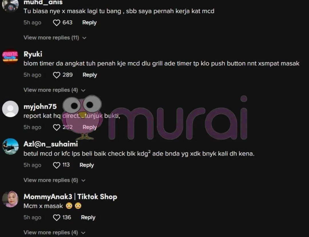 Menjengah keruangan komen, terdapat komen dari bekas pekerja dari restoran tersebut yang mengatakan daging yang diterima oleh pembeli itu tidak masak. Bukan itu sahaja, ada juga memberi pendapat kepada pembeli tersebut untuk membuat laporan dan sertakan bukti pada pihak atasan restoran makanan segera itu.