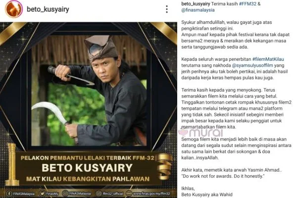 Menjengah ke Instagram pelakon filem Mat Kilau ini, Beto memuatnaik ucapan istimewa atas pengiktirafan dan anugerah yang diterimanya semasa di festival tersebut.